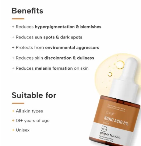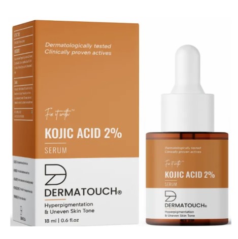 DERMATOUCH Kojic Acid Serum 2% (18 ml) is a lightweight, non-greasy formula designed to target dark spots, pigmentation, and uneven skin tone. Powered by 2% Kojic Acid, Niacinamide, and Alpha Arbutin, it helps inhibit melanin production, brighten the complexion, and promote a more even skin tone. Enriched with Hyaluronic Acid, Panthenol, and natural extracts like turmeric and witch hazel, it hydrates and soothes while reducing discoloration. Suitable for daily use on most skin types, this dermatologist-tested serum works best when followed by sunscreen during the day.